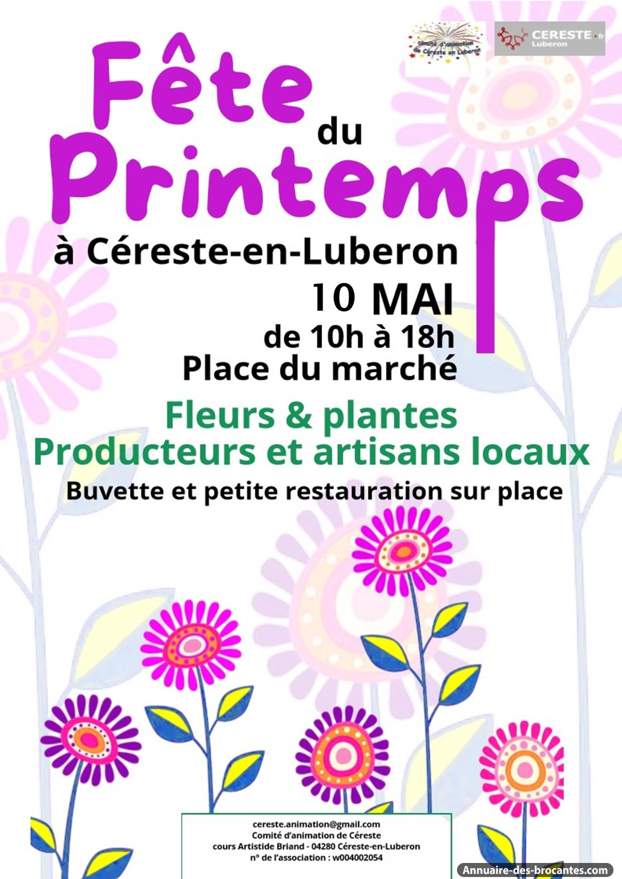 🌸 CÉRESTE FÊTE LE PRINTEMPS : ÉDITION 2 ! 🌸 Après le succès retentissant de l'an dernier (45 stands et une foule ravie), nous remettons le couvert ! Vous êtes artisan, producteur local, pépiniériste ou créateur ? Vous avez du talent et vous voulez le faire savoir ? Rejoignez-nous pour une journée placée sous le signe de la convivialité, du terroir et du partage. ✨ Pourquoi exposer cette année ? • Visibilité Boostée : Nouveauté 2025 ! Un animateur micro passera sur chaque stand tout au long de la journée pour mettre en lumière votre savoir-faire et vos produits. • Ambiance Festive : Entre le marché floral, les stands d’artisanats, les balades à poney et le manège écologique offerts aux enfants, tout est prévu pour attirer les familles et les visiteurs. • Cadre Idéal : Une fête en plein air au cœur de notre beau village de Céreste-en-Luberon. ________________________________________ 📅 Infos Pratiques • Quand ? Dimanche 10 mai 2025, de 10h à 18h. • Où ? En extérieur, sous le soleil de Céreste. • Tarif ? Toujours aussi attractif : 4,00 € le mètre linéaire. ⚠️ Attention : Les places partent vite suite à la réussite de l'an dernier. Ne tardez pas à réserver votre emplacement !. 📩 Contact & Réservations Prêts à fleurir avec nous ? Contactez Marie & Gérard : 📞 06 41 55 36 26 📧 cereste.animation@gmail.com ________________________________________