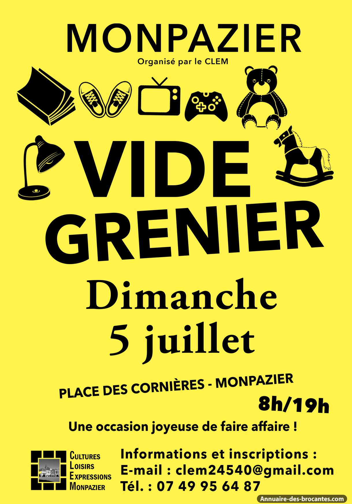 Comme chaque année, le CLEM vous donne rendez-vous pour ses vide-greniers à Monpazier, le premier dimanche de juillet et de septembre, de 8h à 19h. Venez chiner, vendre et profiter de l’ambiance conviviale du village !