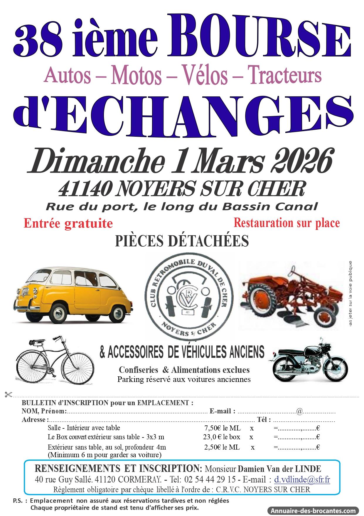 Bourse autos, motos, miniatures, documentation, accessoires et pièces ayant un rapport direct avec la locomotion ancienne. Rue du port (le long du bassin canal) 41140 Noyers sur CherDans quel endroit ?