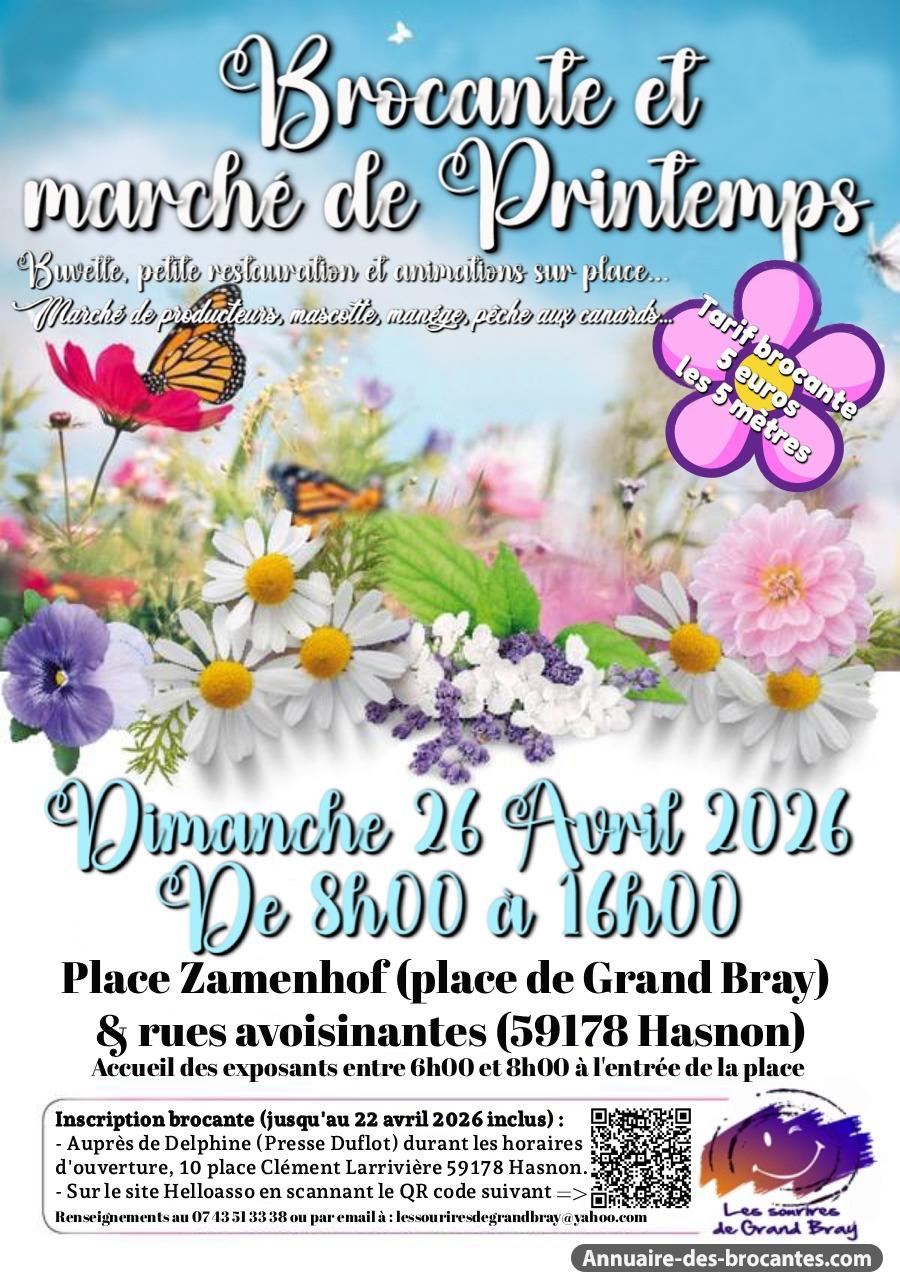 Pour la 4ème année, dans le cadre de ses actions en faveur des habitants du quartier de Grand Bray et de la commune d’Hasnon, l'Association "Les Sourires de Grand Bray" organise sa brocante et son marché de Printemps, le dimanche 26 avril 2026 de 8h00 à 16h00 sur la place Zamenhof et les rues avoisinantes (quartier de Grand Bray à Hasnon 59178).